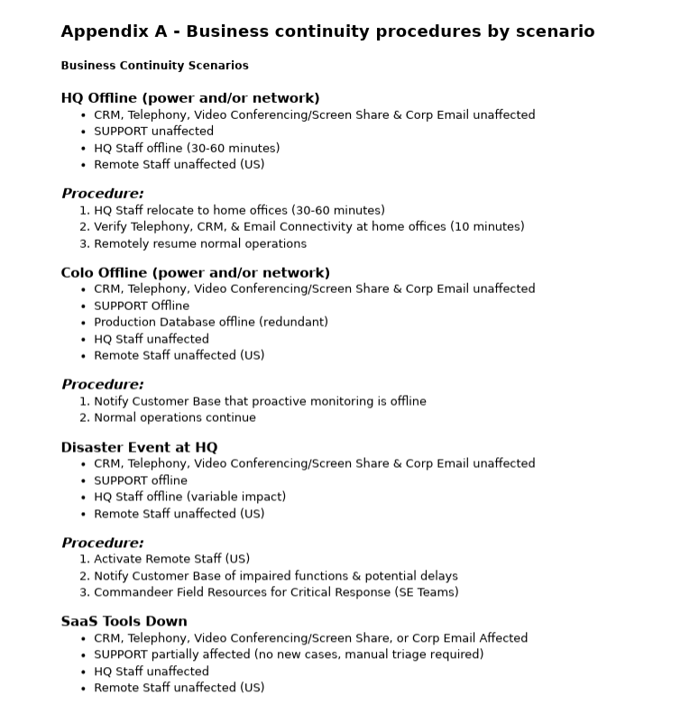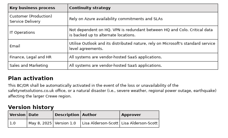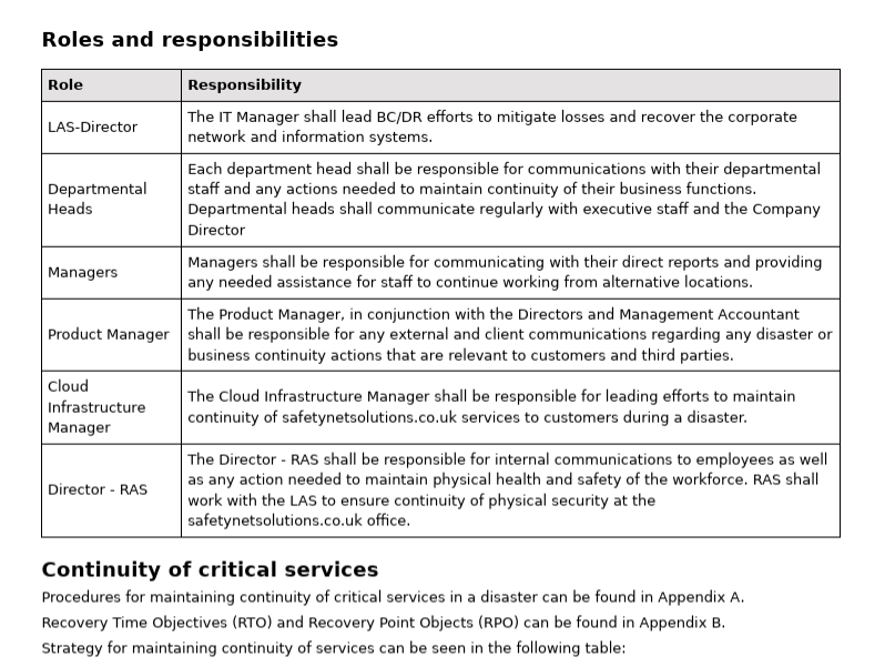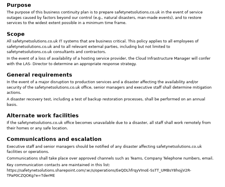 Business Continuity and Disaster Recovery Plan How is Safetynet prepared in the event of services outages caused by factors over which we have no control?