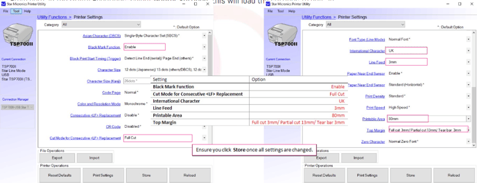 From here, in the Utility Functions, select Printer Settings, this will load the settings to edit. In here, change the following settings using the table below: