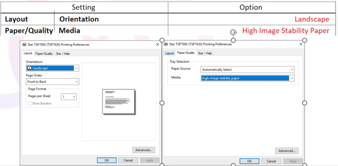 In the Layout tab, ensure Orientation is set to Landscape. In the Paper/Quality tab, ensure Media is set to High image stability paper.