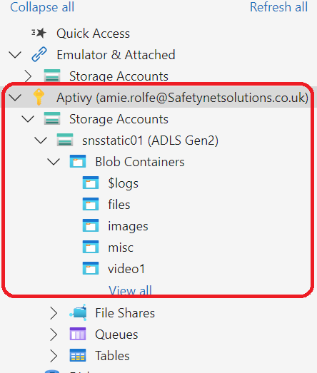 - Once logged in, you will need to expand 'Aptivy' (the email address you are logged in with will show next to this) > Expand Storage Accounts > Expand snsstactic01 (ADLS Gen2) > Expand Blob Containers.