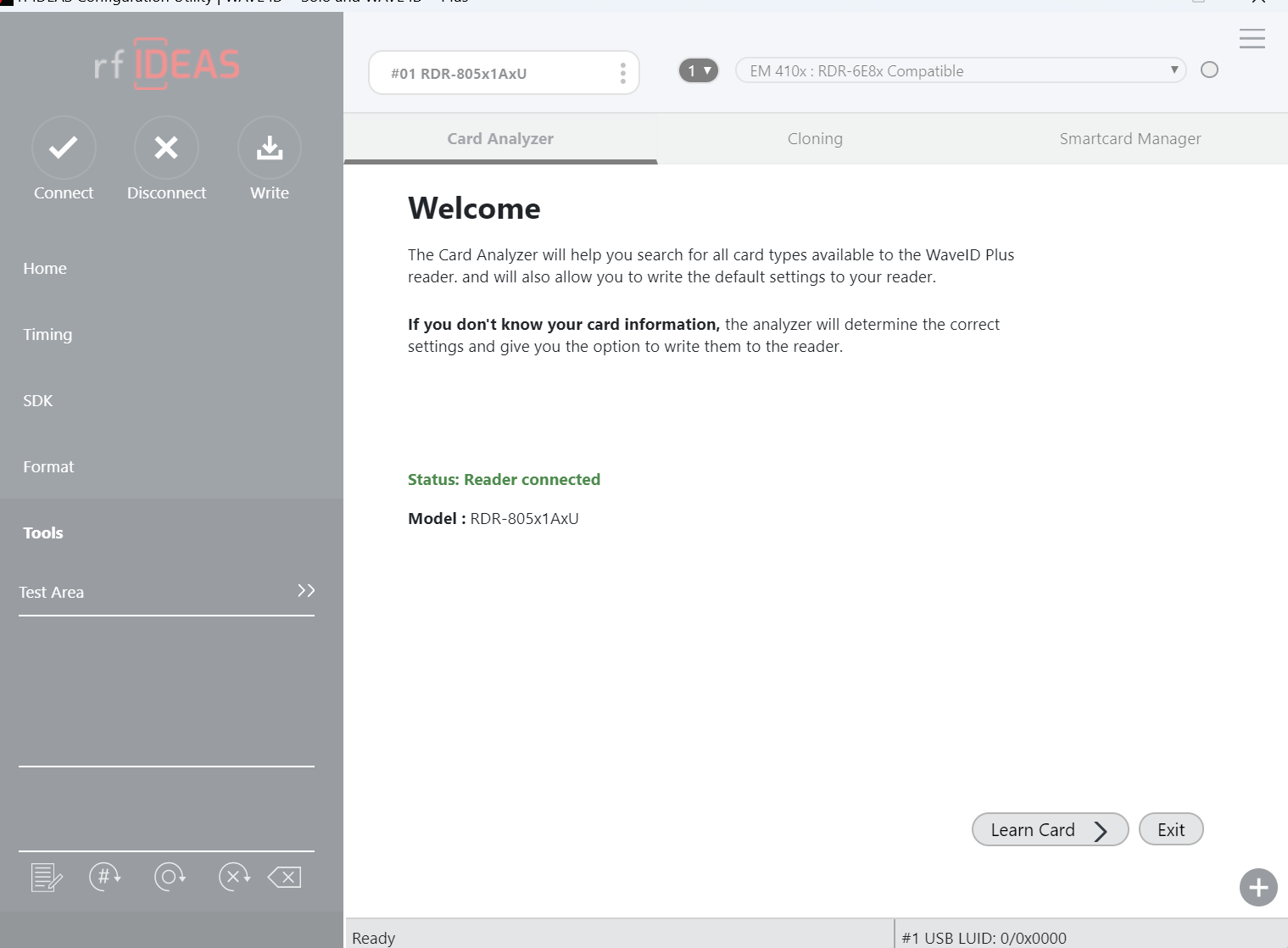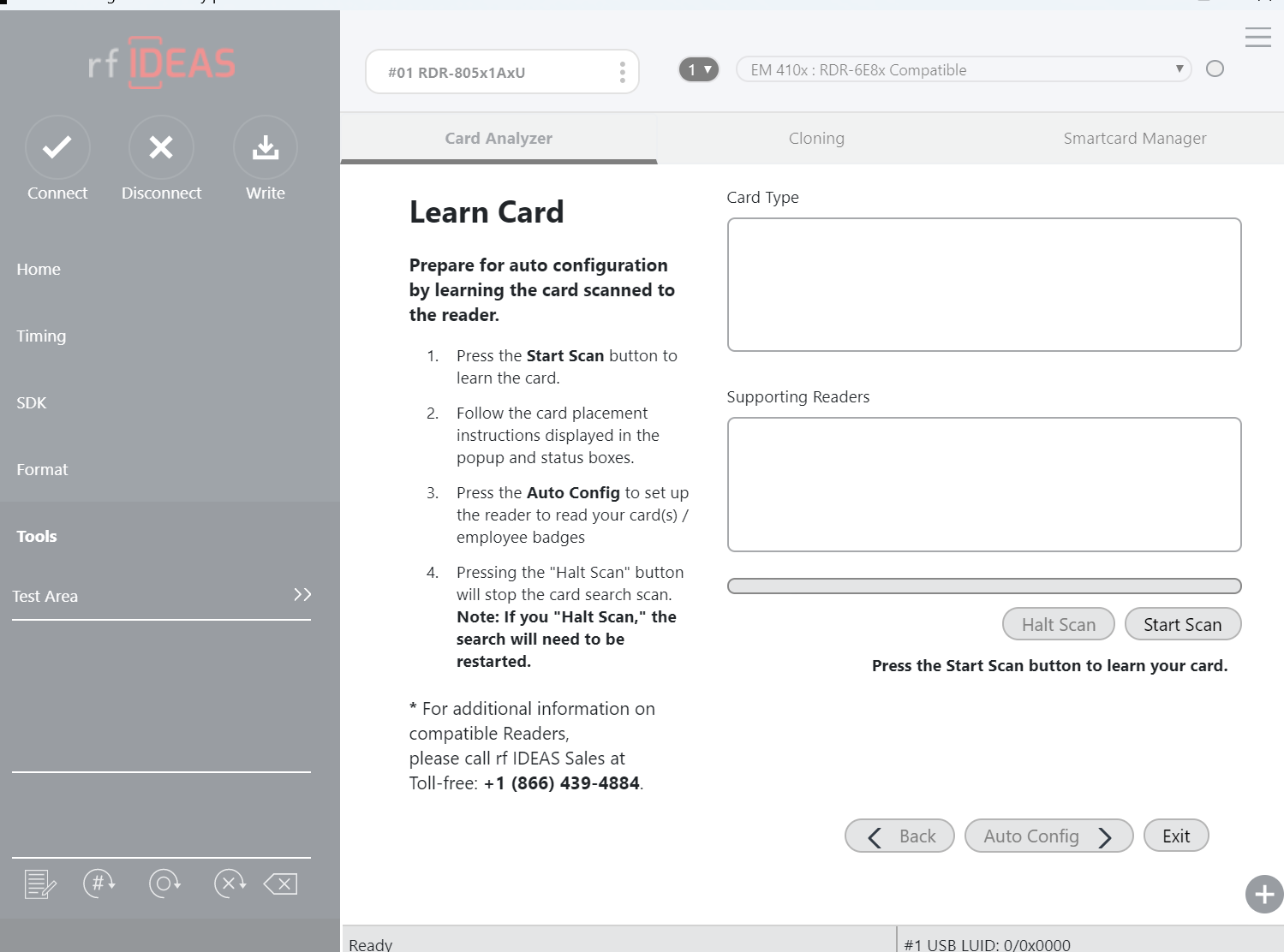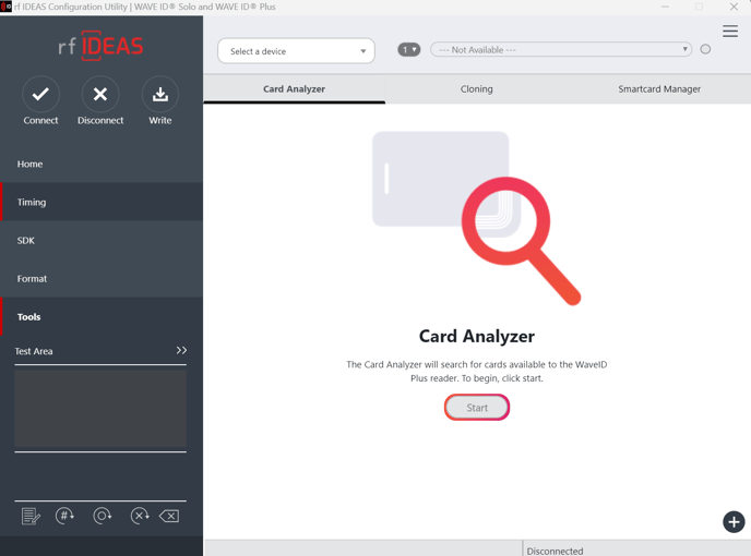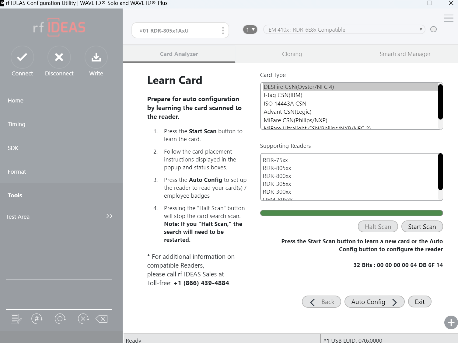 Step 10 - On the top left of the screen select "Disconnect" and then "Connect" to check that the configuration is saved on the reader. So long as the reader comes up with the same configuration that was set up the process was successful.