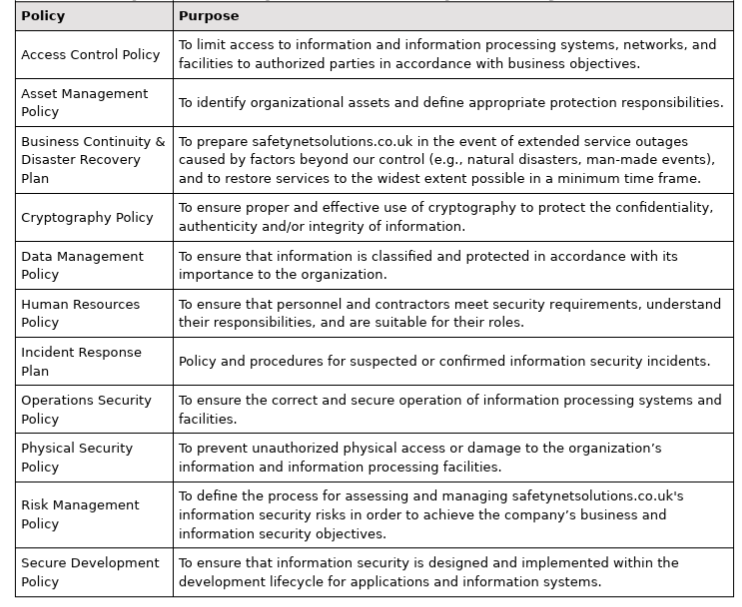 The purpose of this policy is to communicate our information security policies and outline the acceptable use and protection of safetynetsolutions.co.uk's information and assets.