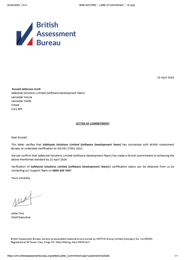 Is Safetynet Solutions Ltd ISO 27001 compliant This KBA shows our commitment to achieving this - audit ready by November 2025