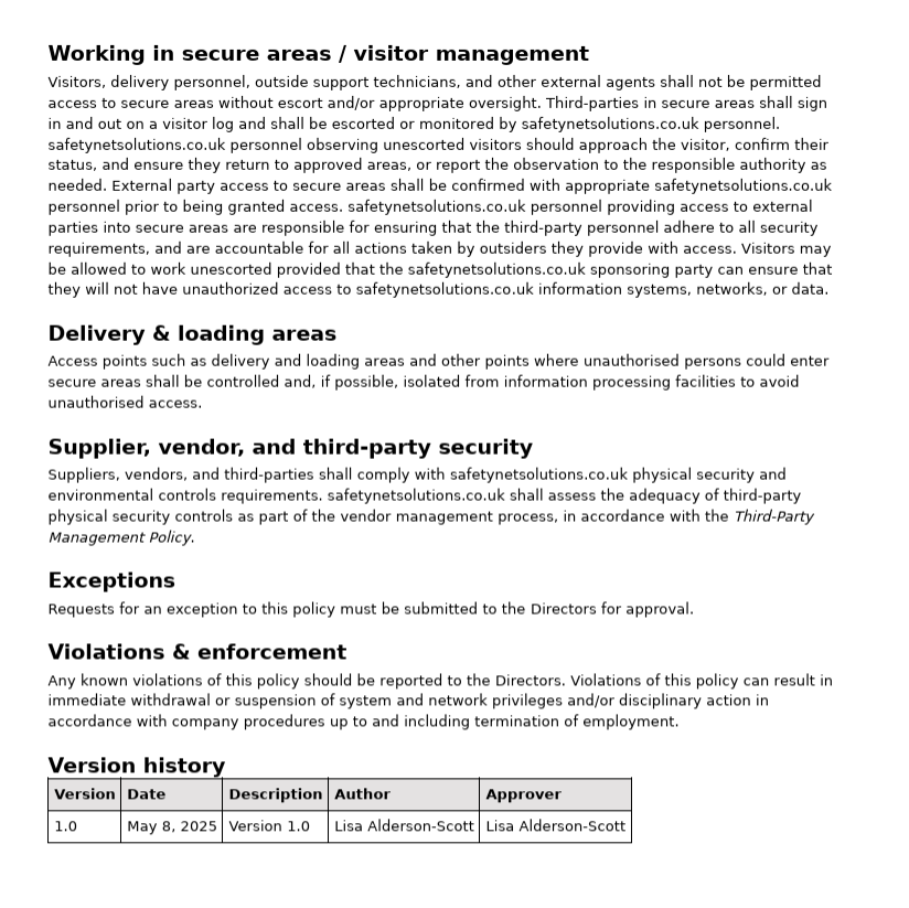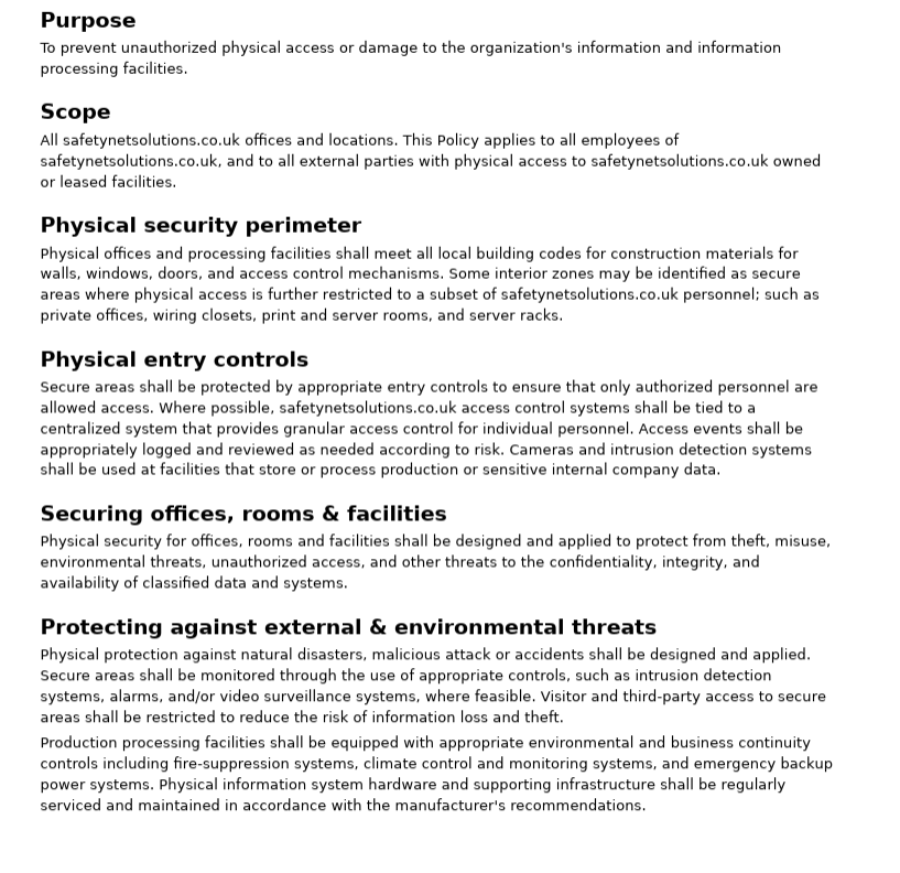 Physical Security Policy To prevent unauthorised access to information and information processing facilities