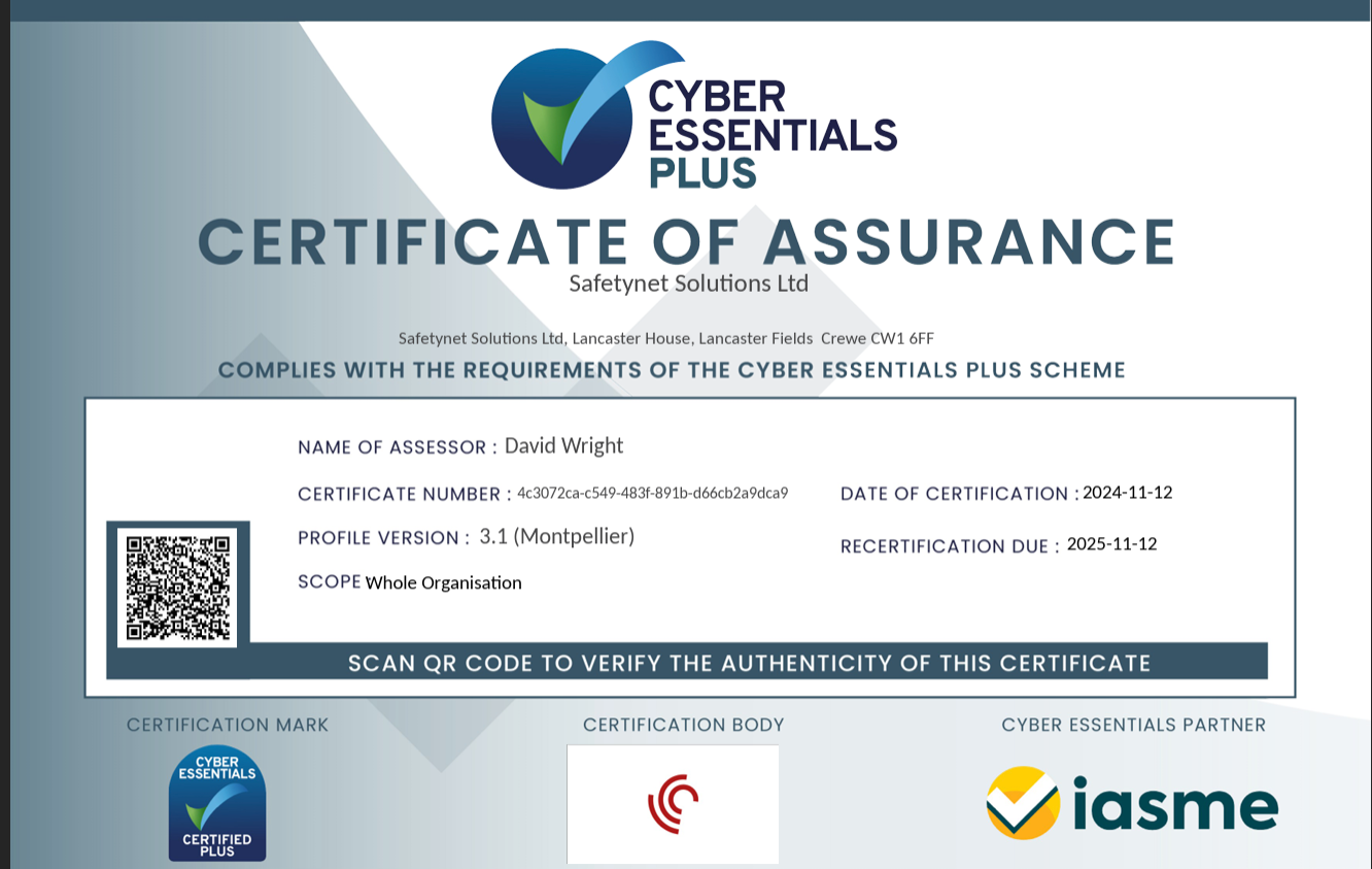 Current Certification for CE+ for Safetynet Solutions Ltd