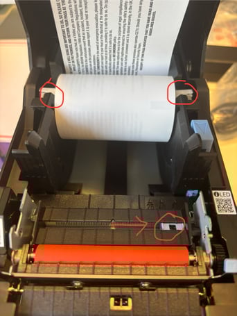 Secondly, the roll also needs to be held in place by the white prongs in the image. The paper can be put into place by lifting roll into place from below the prongs. Placing the roll at the base of the printer, like the previous model will instead display a paper error.