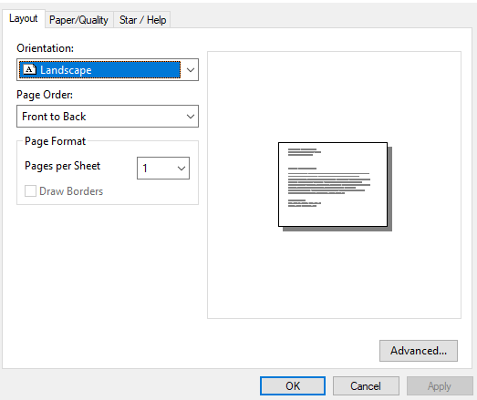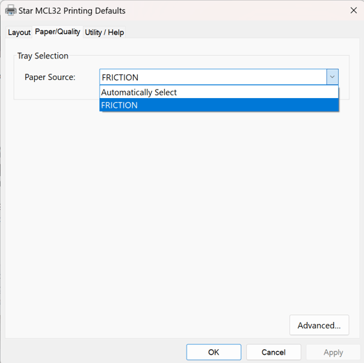 On the Layout tab, ensure Orientation is set to Landscape. In the Paper/Quality tab, ensure Paper source is set to FRICTION.