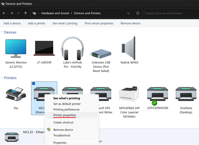Navigate to the Control Panel -> Devices & Printers, right-click the MCL32 Printer and click 'Printer Properties'.