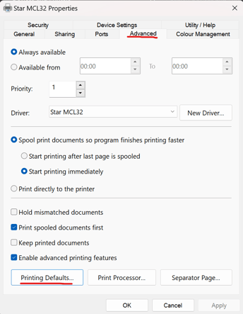 When the window opens, click on the ADVANCED tab, and click on 'Printing Defaults' at the bottom…