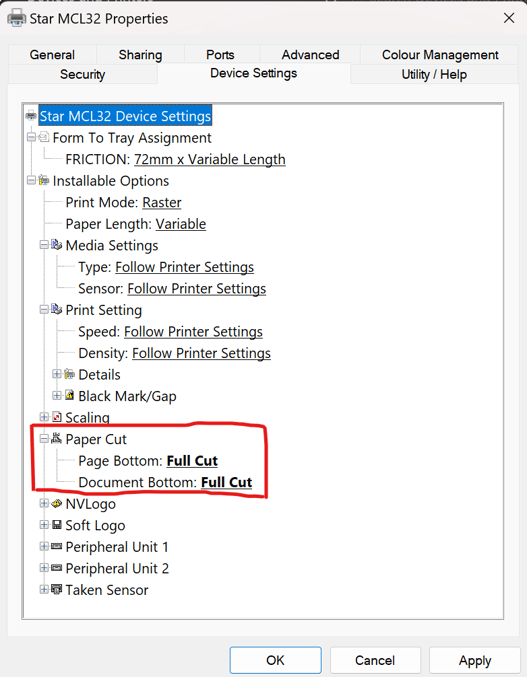Above the Advanced tab, you will see a 'Device Settings' section. Inside of the device settings, you will need to amend a couple of Paper Cut options.