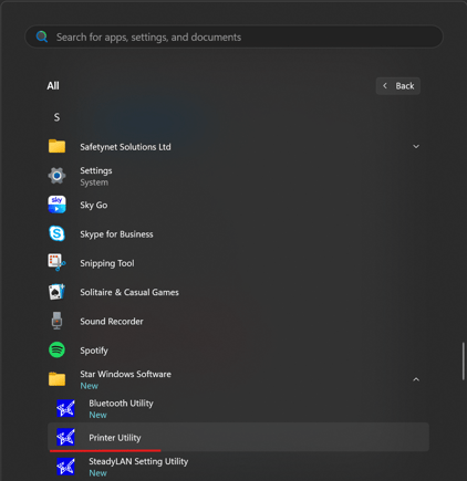 Now installed, the utility can be found via Start (Windows Icon) -> ALL -> Scroll down to S -> Star Windows Software -> Printer Utility